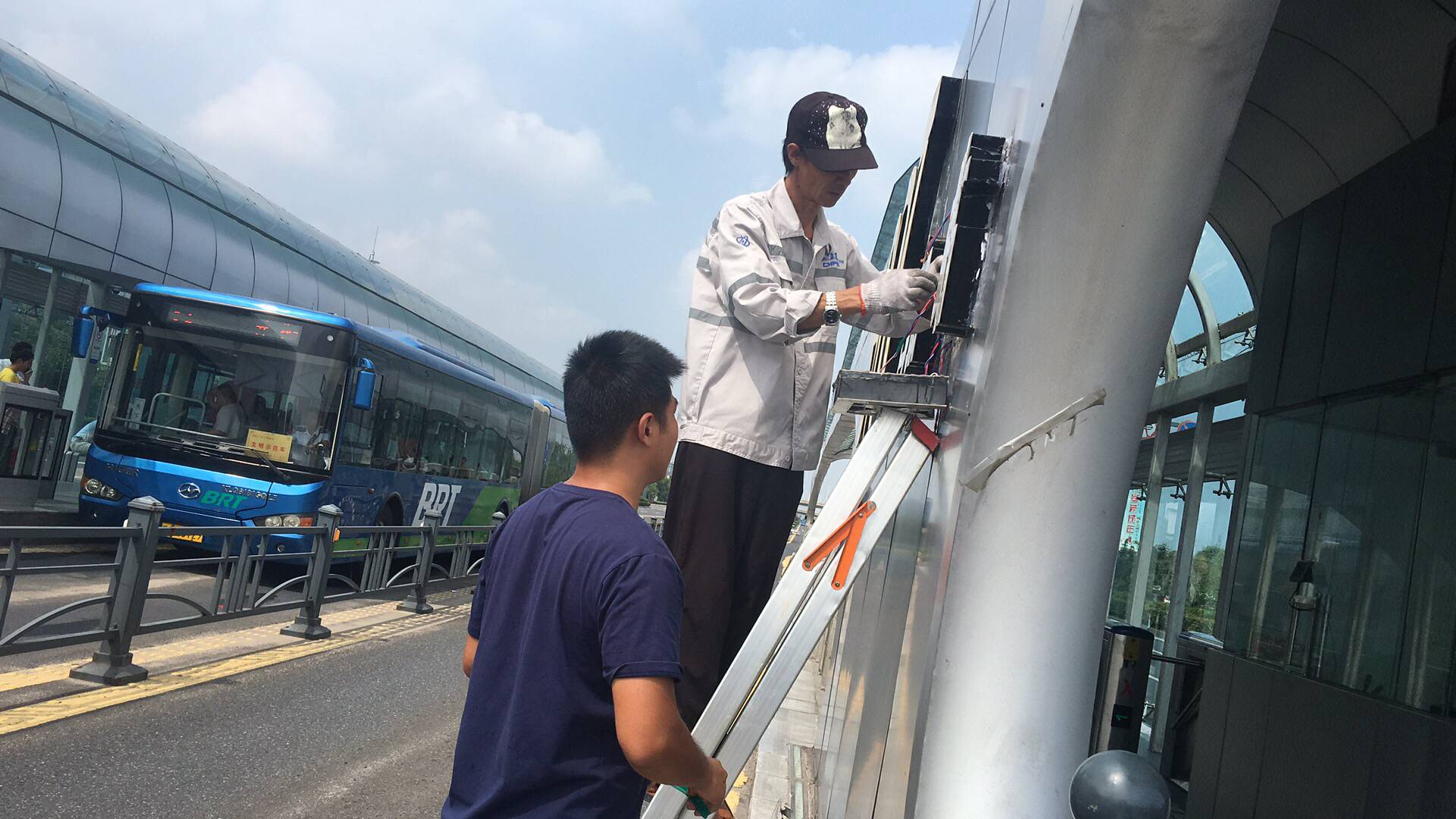 公交集团快速公交公司总务科智能化维护人员顶着烈日奋斗在站台创文一线,修复站台大面积破损地胶,保证站台美观性及安全性;排除空调故障,确保票房及设备间内各设备正常运行;在站台护栏及对危险路段的站台尾部基座张贴反光贴,有效预防站台安全事故;并在安全门地面处粘贴黄色警示标,规范乘客乘车秩序,同时确保站台硬件设施正常运行。