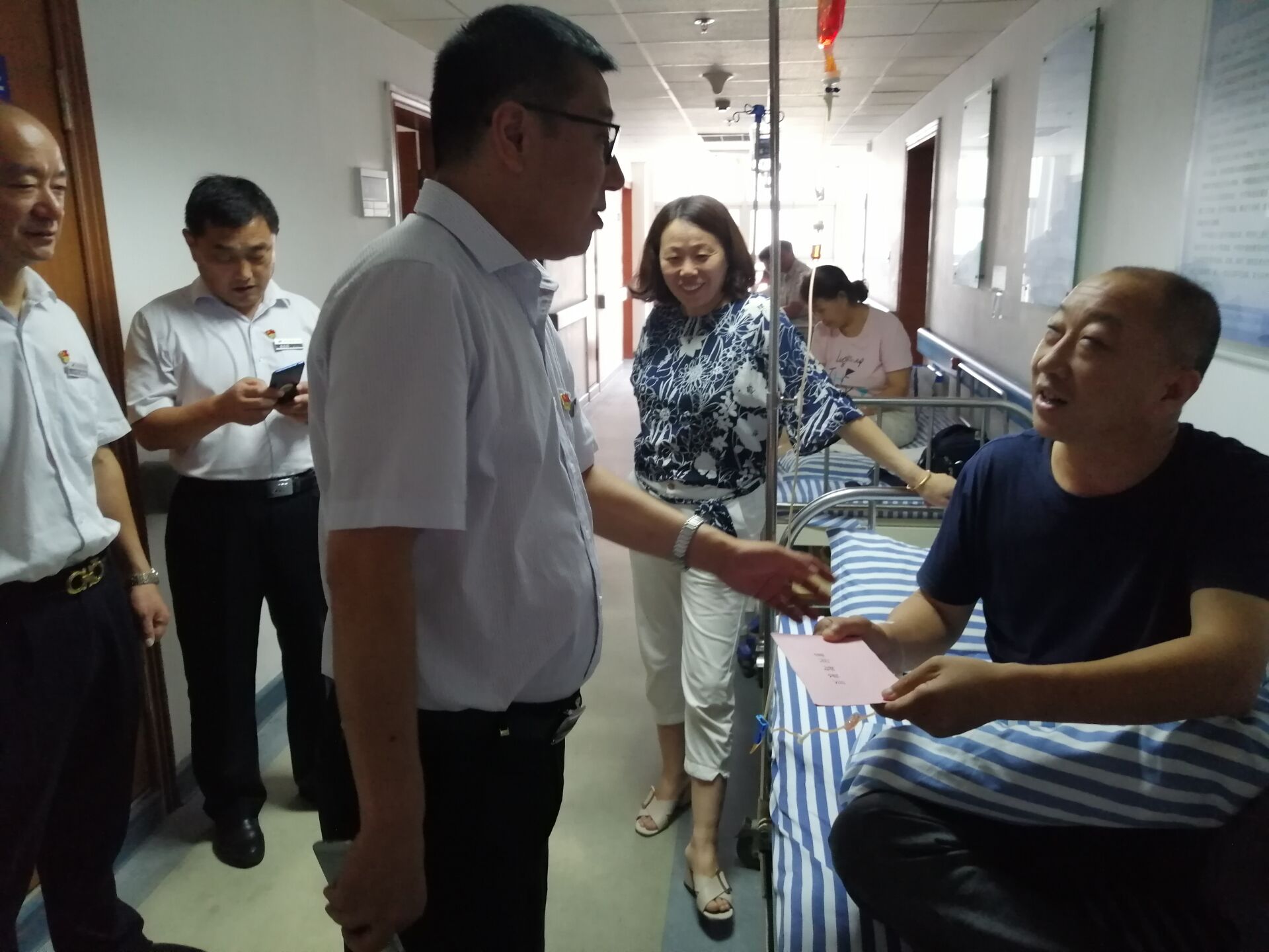 7月15日上午,快客公司经理董红波带领副经理姜永中、云正勇及办公室相关人员,冒着酷暑来到市中医院探望慰问因股骨头缺血性坏死住院的驾驶员张建华同志,并将慰问金送到他手中,为张建华同志送去公司的关怀与温暖。