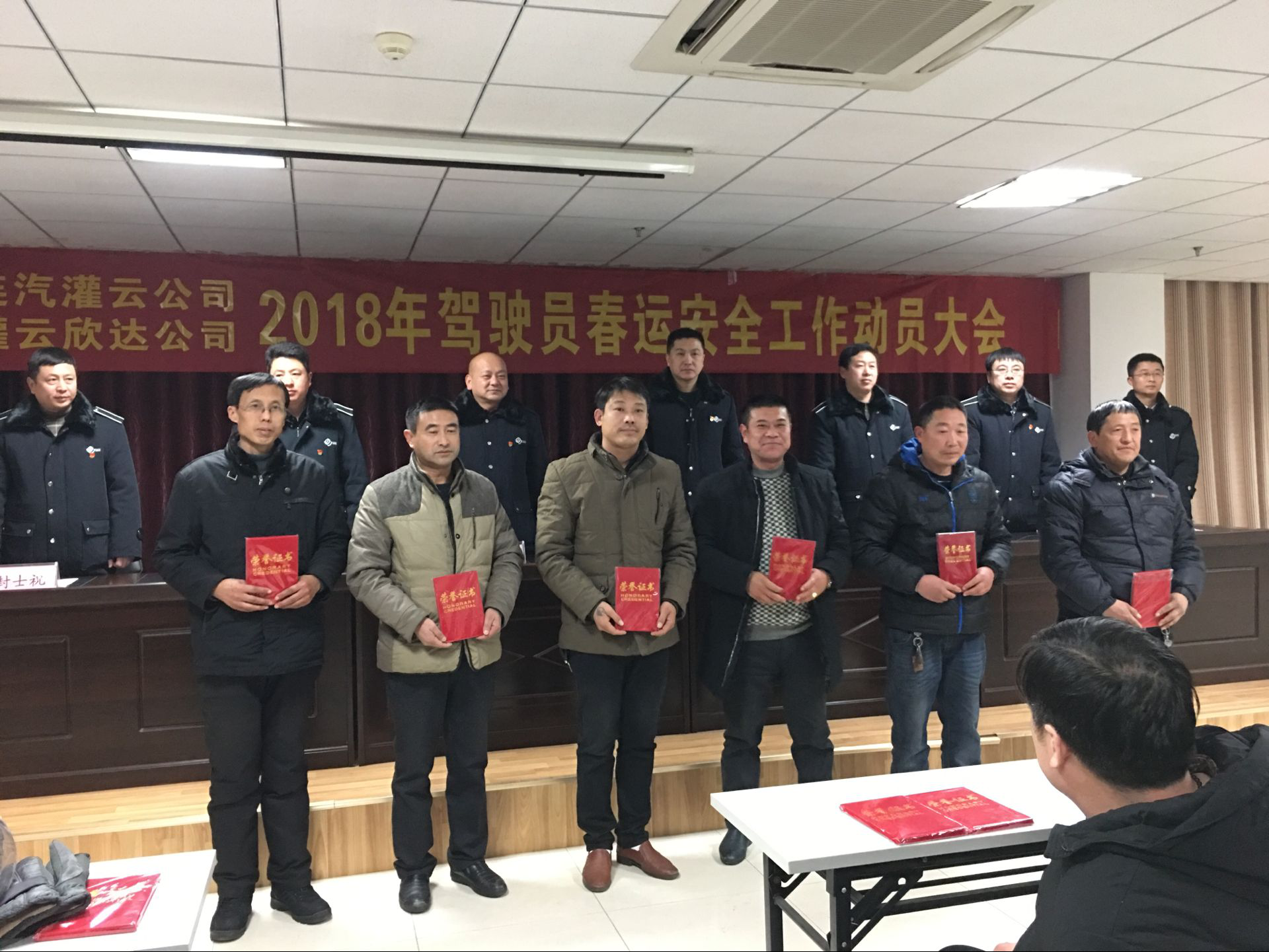在会上,穆加军副经理传达了《关于组织开展2018年春运安全行车竞赛》以及《关于认真做好2018年春运安全保障工作的通知》,苏涛书记对获得汽车公司优秀驾驶员和安全行车百万公里无事故驾驶员进行了表彰;魏海波副经理对获得灌云公司优秀驾驶员和安全行车标兵进行了表彰。