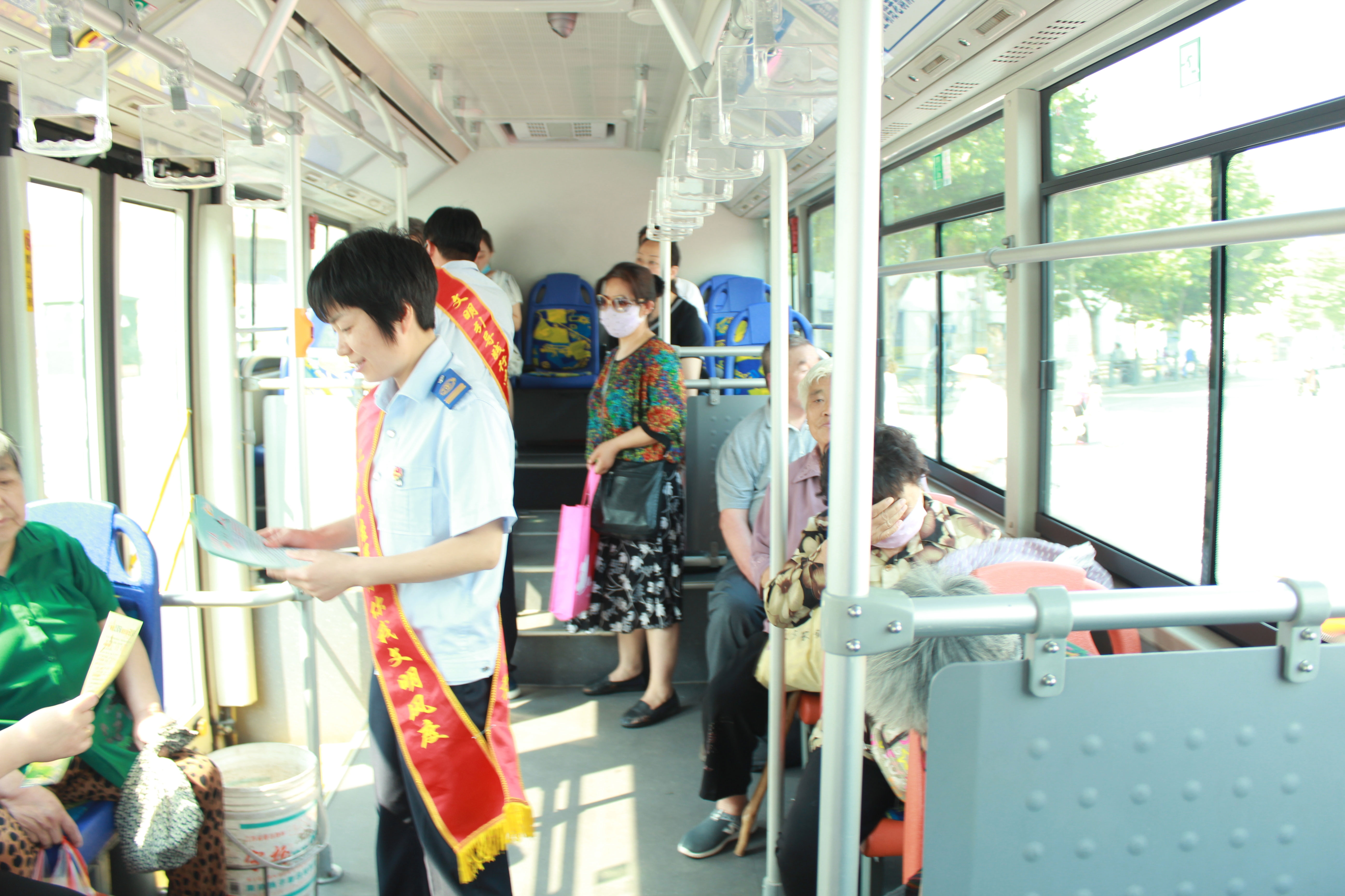 公交东部公司以“全面落实企业安全生产主体责任”为主题,扎实开展了“安全生产月”宣传咨询日活动,积极普及安全生产知识,倡导文明乘车,提高群众交通安全意识,助推了全国文明城市创建工作。在活动现场,公司悬挂安全横幅和放置了安全宣传展板,展板内容包括事故警示图片、安全管理图片和“安全生产月”主题等。同时,公司组织管理人员佩戴文明服务绶带,深入公交站亭及车厢,向广大市民乘客宣传安全乘车常识、公交车禁止携带危险物品、应急避险知识、文明乘车常识等。