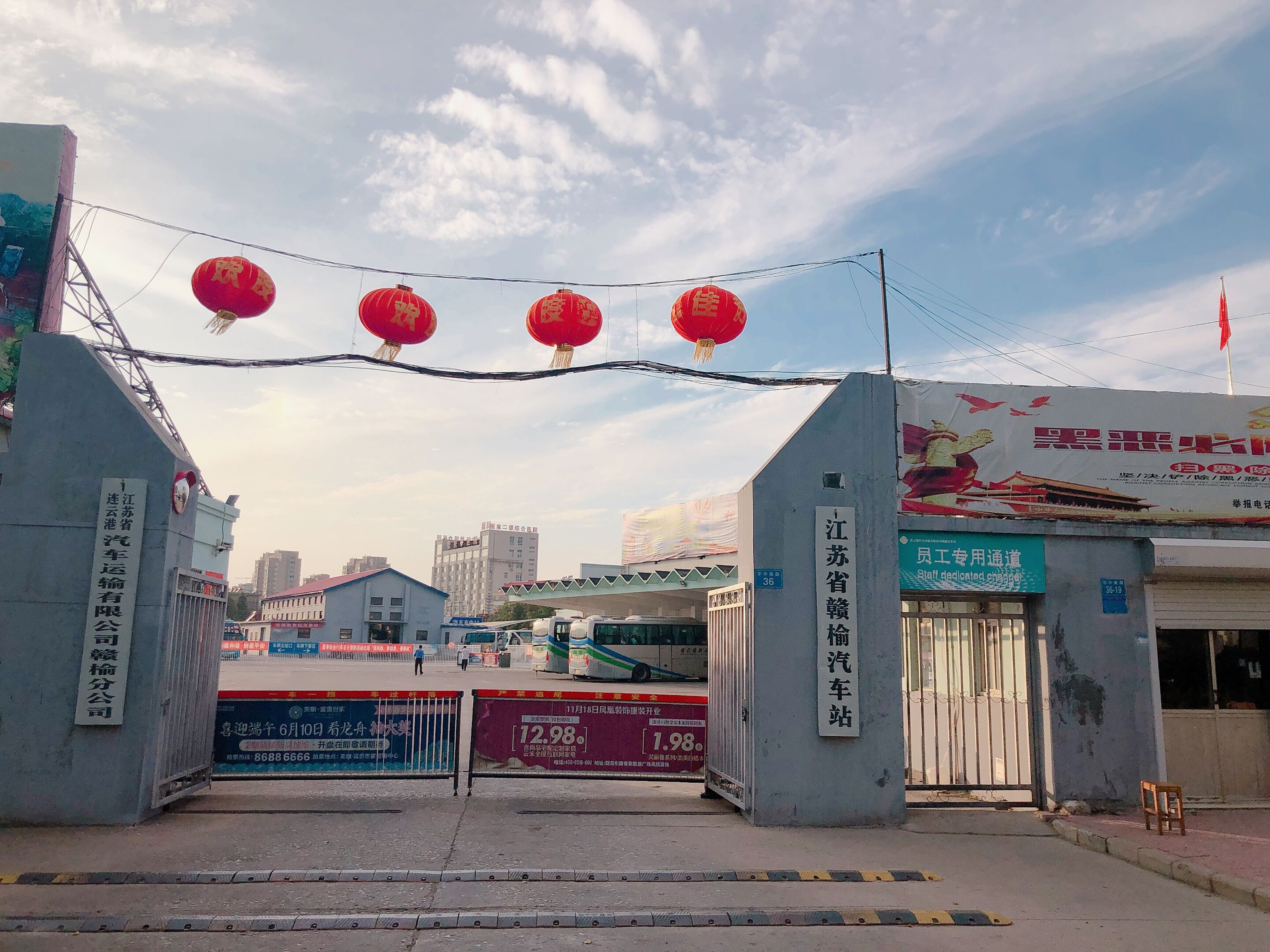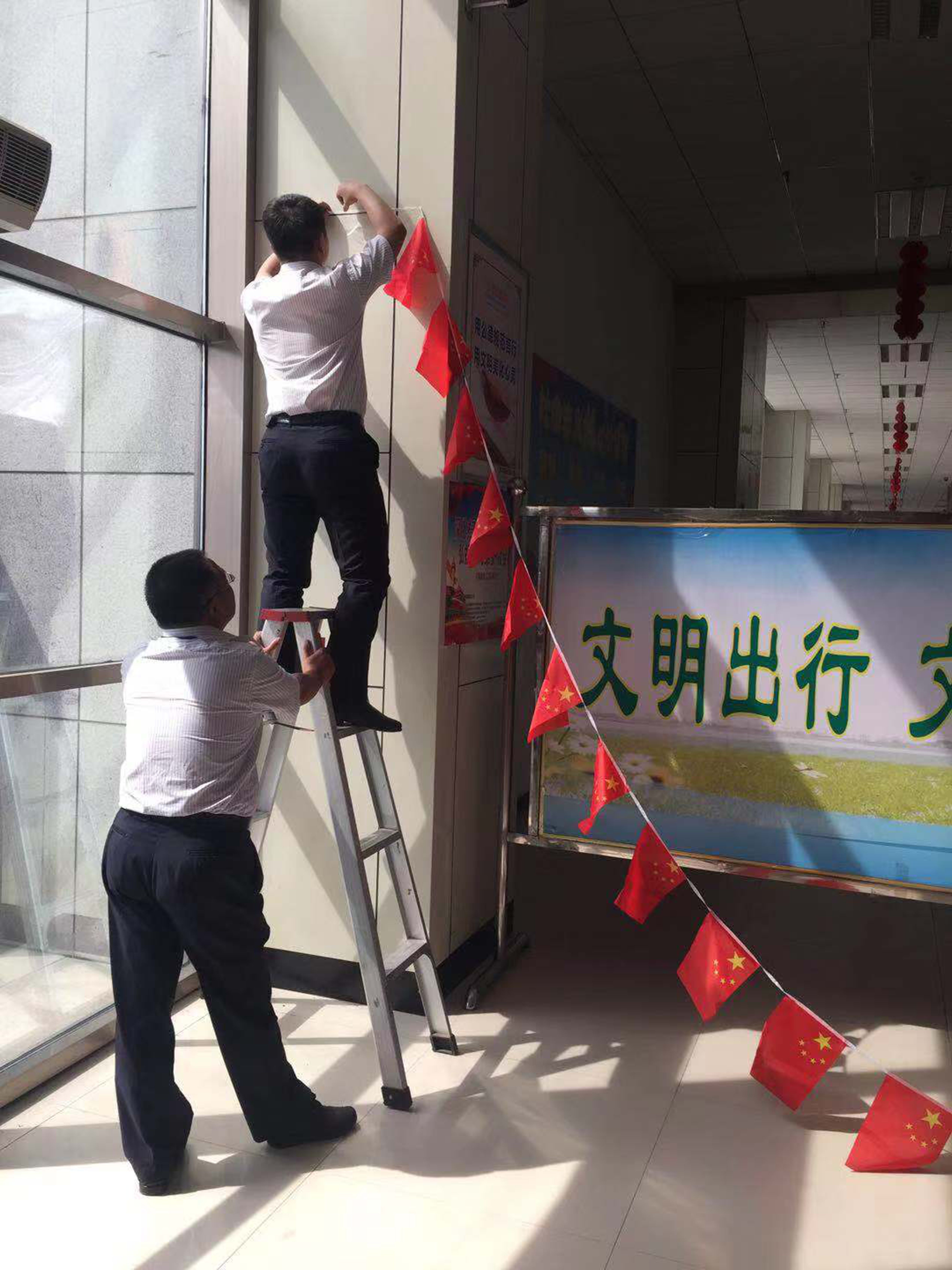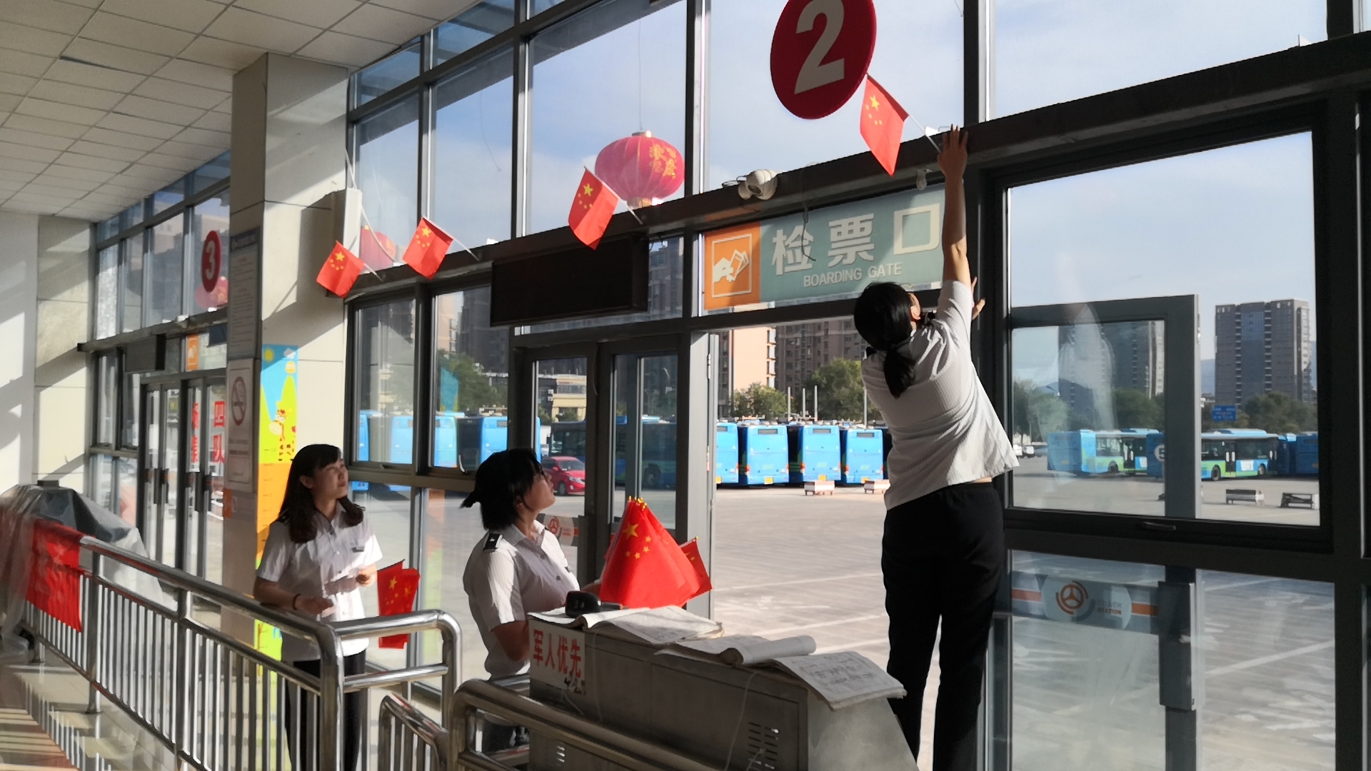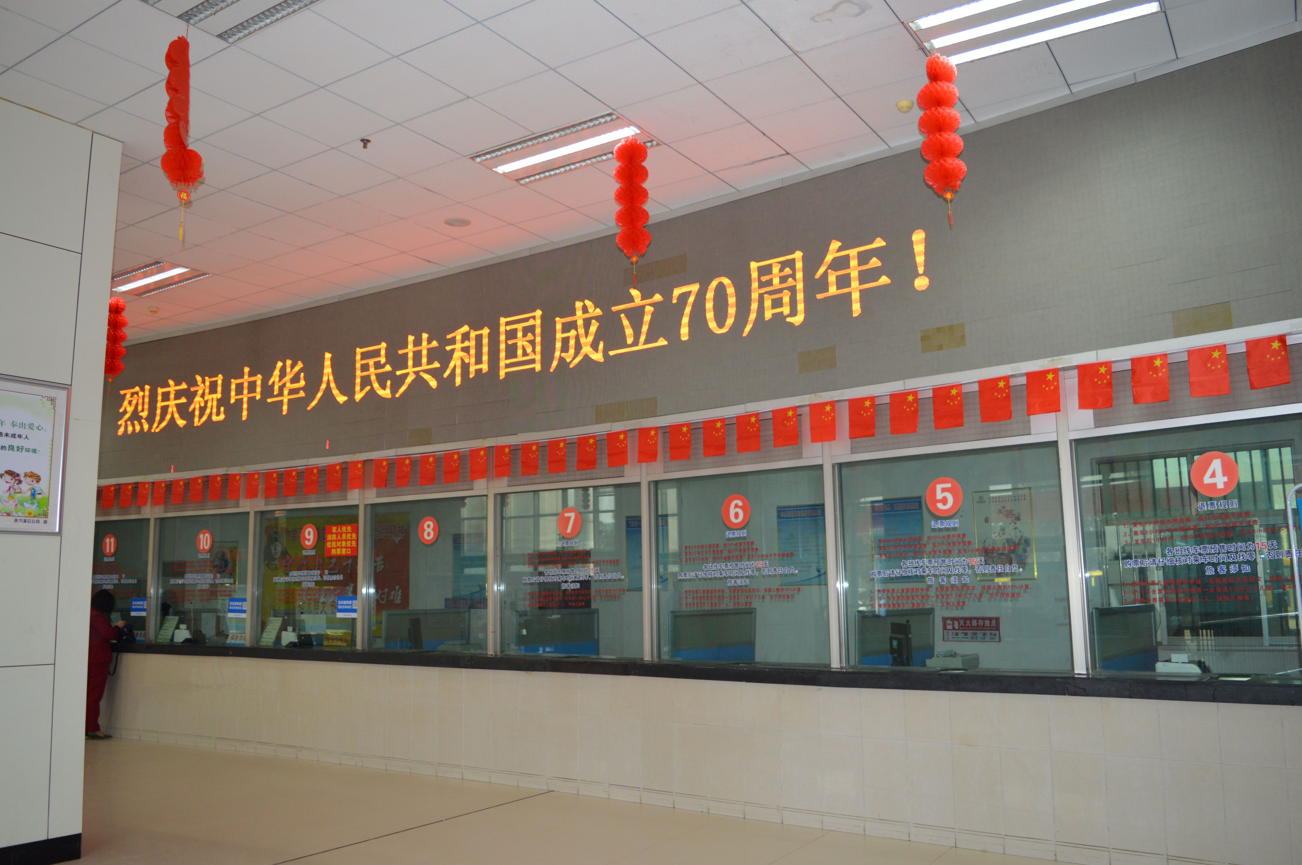 连汽赣榆、灌云公司的职工们自己动手在进出站口、候车室、站场绿化带等处悬挂大红灯笼、标语横幅、小红旗,客运东站还在候车大厅摆放“不忘初心、牢记使命”公益宣传牌。各售票厅、候车室LED显示屏滚动播放“欢度国庆”“热烈庆祝中华人民共和国成立70周年”等主题宣传内容。
