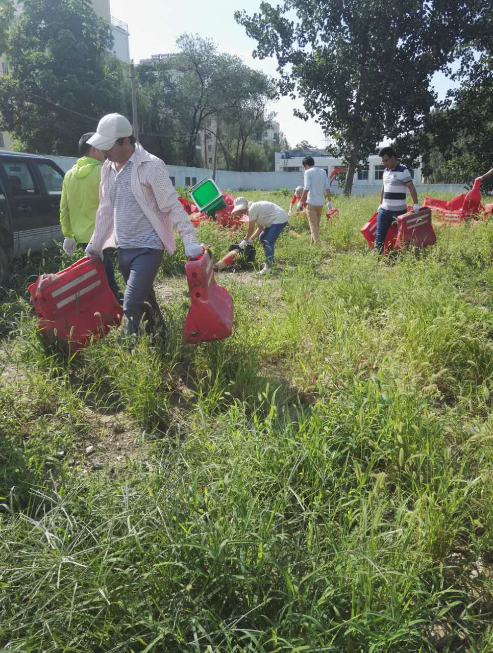 此时虽已立秋,但“秋老虎”一点也不客气,阳光甚是强烈。三十多度的高温下,不到半个小时,劳动人员身上就已经流汗湿透,但这并没有影响他们的积极性。经过一个小时的努力,停车场的杂物基本清理干净,地面杂草全部除净。