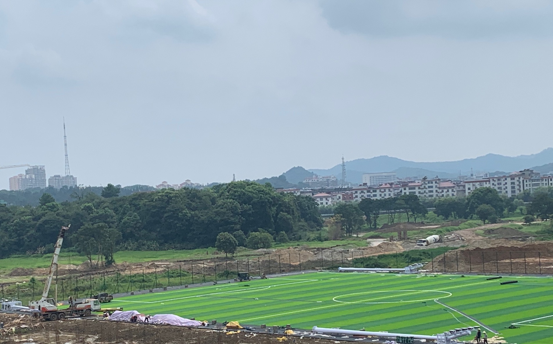 足球场长:115米;宽:78米。采用60cm厚宕渣填筑;20cm厚水泥稳定碎石稳定层;5cm厚中粒式沥青混凝土;3cm厚细粒式沥青混凝土;5cm厚人造草面层。1.3cm塑胶面层。6-7月份是当地雨季,雨水较多,项目部克服种种困难,历经一个多月的时间完成足球场主体工程,比业主约定日期提前了一个月,得到了业主单位的一致好评。