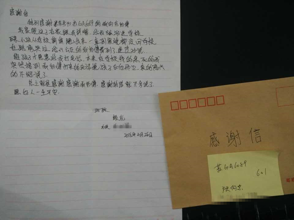 为什么会有这封感谢信呢?原来是写感谢信的市民张先生在家与其孩子拌嘴,孩子却从学校偷偷跑了出来,而且很晚也没返校。张先生非常着急,在学校一直没能找到孩子,就在此时,哭泣的孩子被601路驾驶员张向东发现了,他耐心地询问孩子哭泣的原因,不停地安慰孩子,要孩子用他的电话联系父母。在驾驶员张师傅的热心劝慰下,孩子意识到了自己的行为不对,及时联系上家人。当孩子的家长张先生看到自己的孩子时,十分感谢驾驶员张师傅,孩子的父亲说,“如果不是张师傅看到孩子并劝说孩子,那后果不敢去想。”