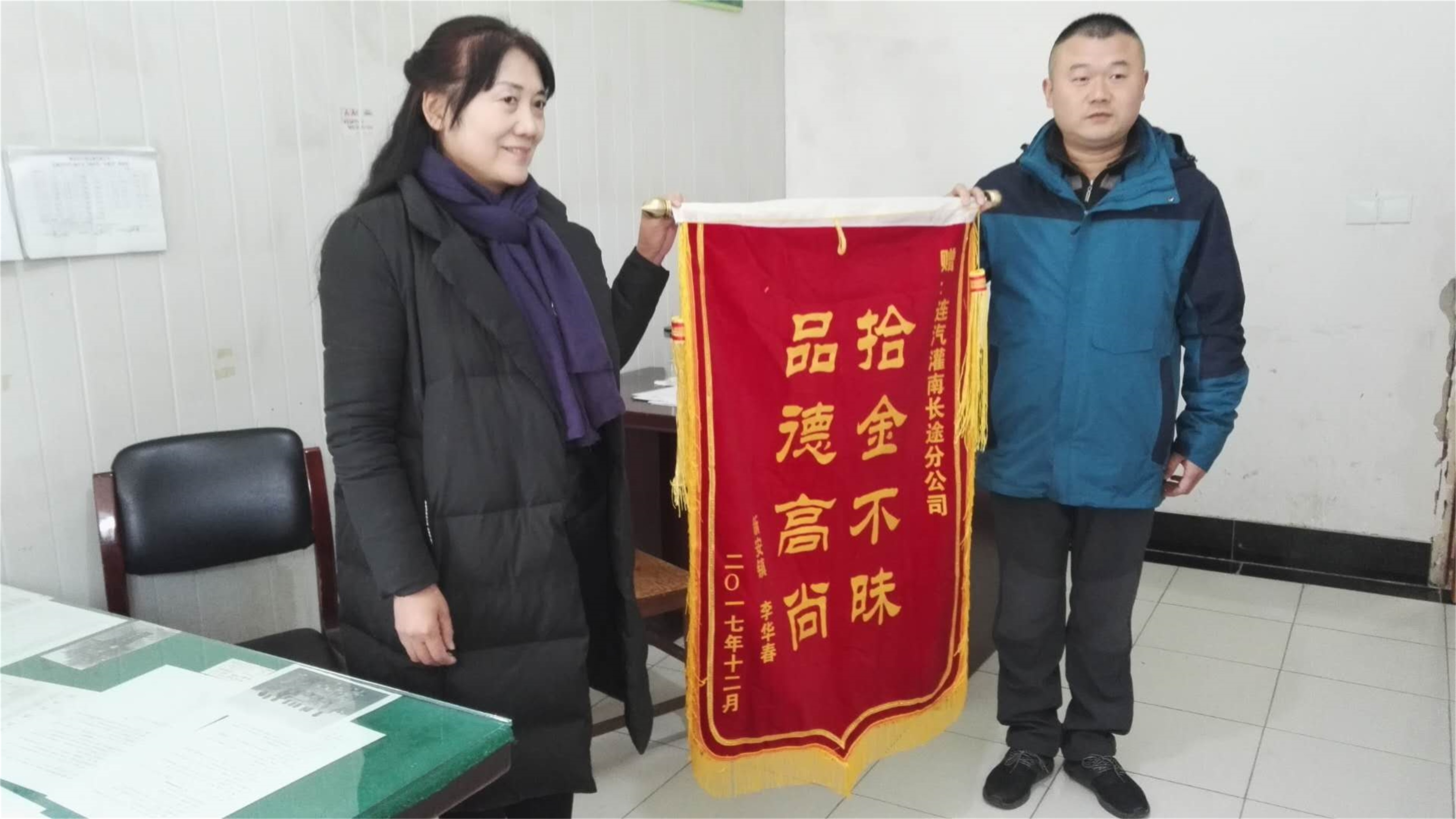 李女士收到钱包后非常高兴,说包内有多张银行卡与做帐发票若干,遗失将给生活与工作带来极大不便。为感谢公司和驾驶员武闯,李女士专门制作一面锦旗送到公司,赞扬驾驶员武闯拾金不昧,品德高尚。