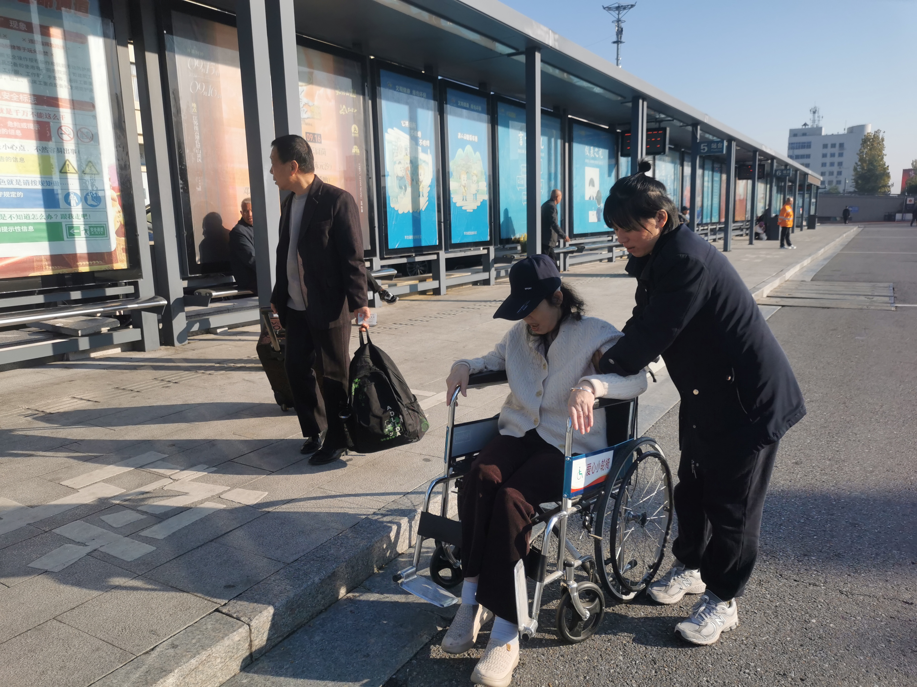 得知老人的困境后,“雷锋车”驿站的工作人员迅速行动起来,她们一边安抚老人的情绪,一边查询公交班次,为老人提供轮椅手推车送至公交换乘点。在工作人员的细心搀扶下,老人安全地坐上了公交车,并得到了车上乘客的热心帮助。