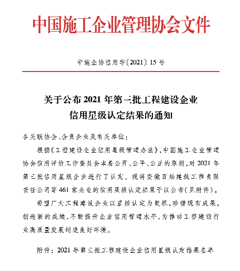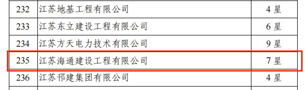 近日,从中国施工企业管理协会信用评价工作委员会传来喜讯,江苏海通建设工程有限公司获得2021年第三批工程建设企业信用7星级认定,在全国第三批参加认定的461家企业中名列前茅。