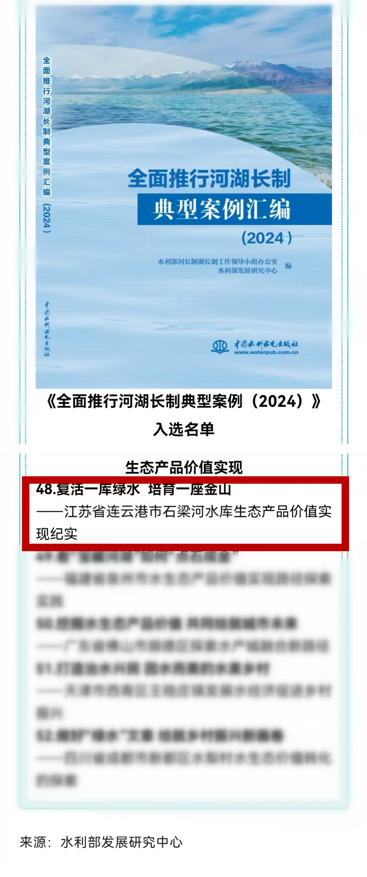 近日,水利部出版发行《全面推行河湖长制典型案例汇编(2024)》,其中由市交通控股集团保护开发、建设修复的石梁河水库,凭借在生态产品价值实现方面的显著成就,以《复活一库绿水 培育一座金山》为题成功入选全面推行河湖长制的典型案例。